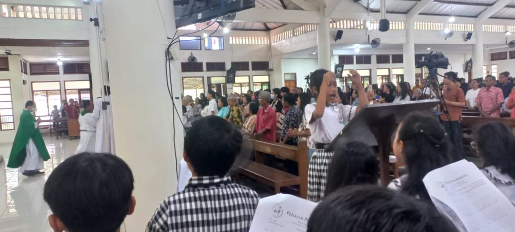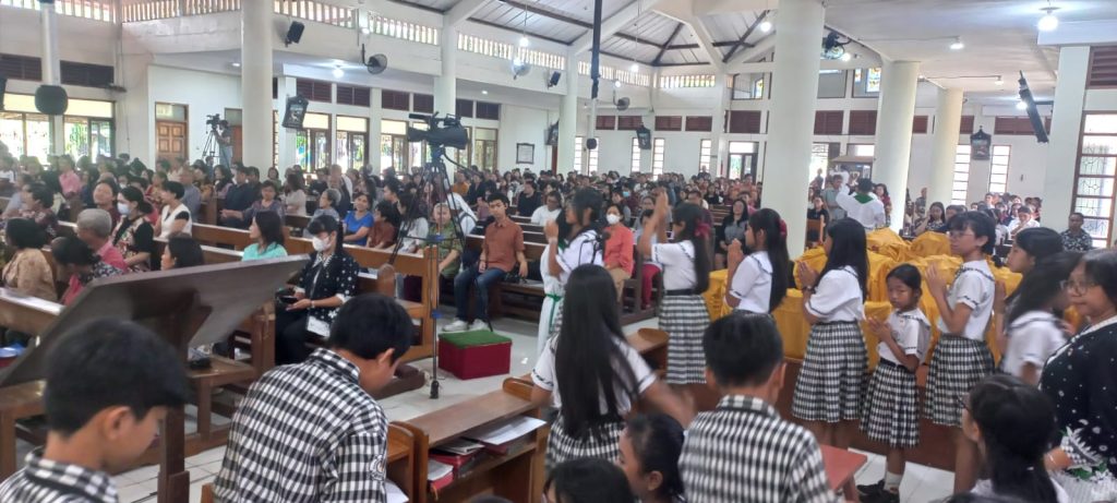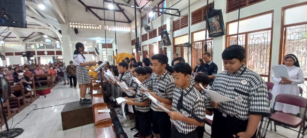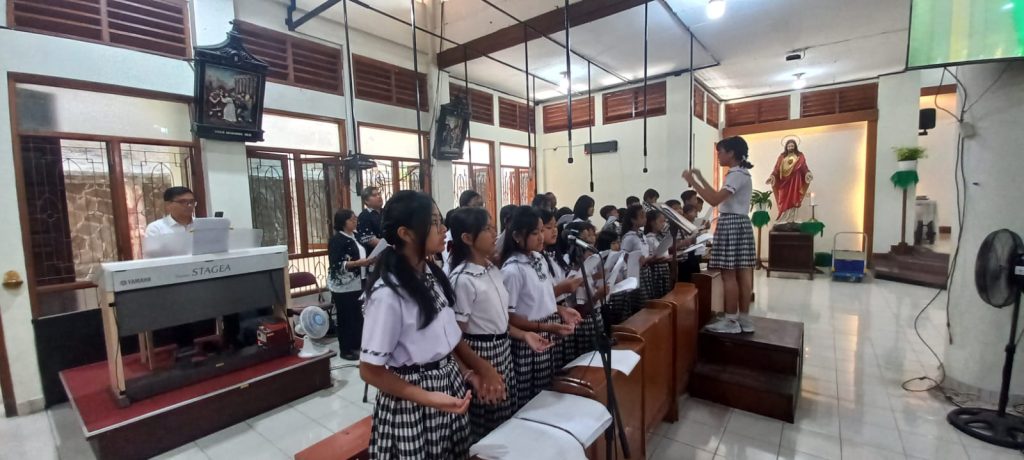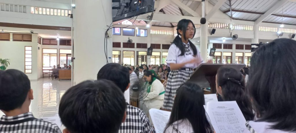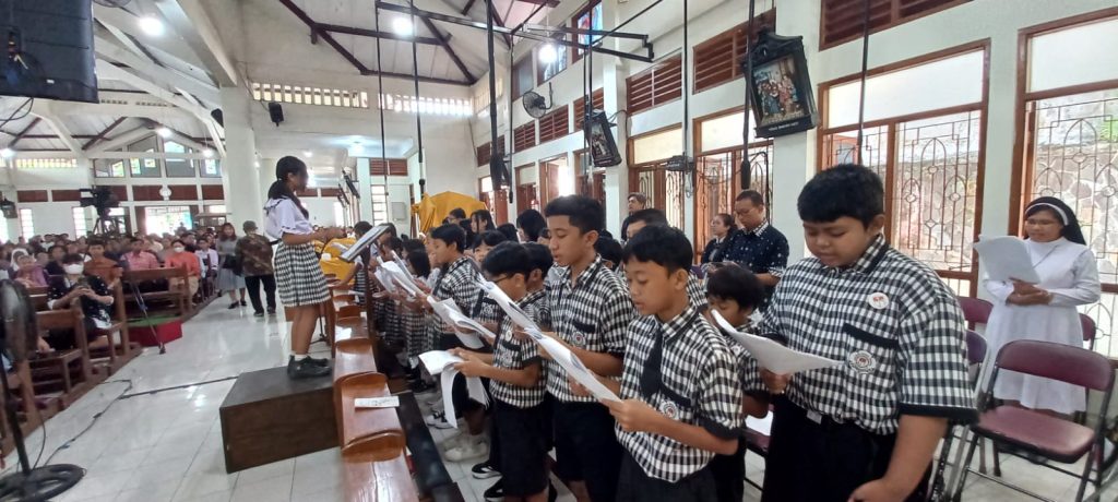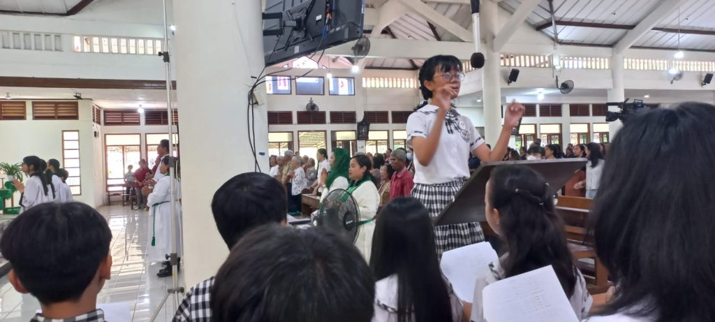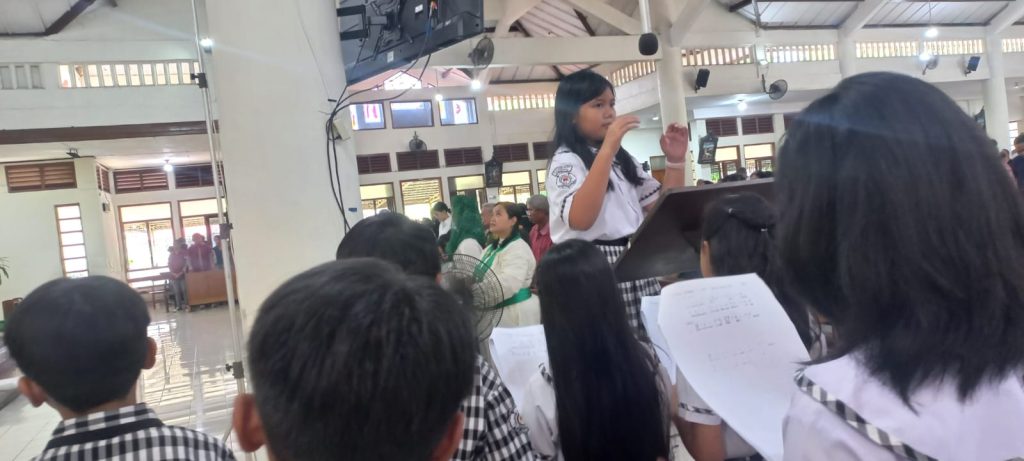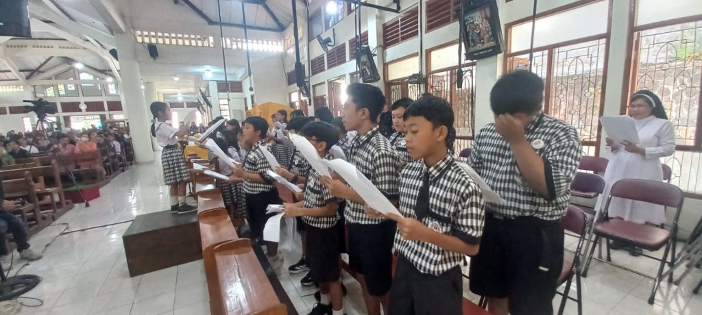 Dipandu oleh para guru pendamping dan pelatih koor sekolah, anak-anak membawakan lagu-lagu liturgi dengan penuh semangat dan penghayatan. Suara mereka yang jernih dan harmonis mengiringi jalannya misa, menciptakan suasana doa yang khidmat dan menggugah.